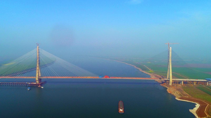 在大橋合龍現(xiàn)場,記者看到,在長江石首故道大垸江畔,兩座倒“Y”型主塔屹立南北兩岸,直插云霄。40名作業(yè)工人正在緊張進行著大橋最后一塊箱梁吊裝合龍的準備工作。這座湖北省投資規(guī)模最大、施工條件最復雜的長江大橋將迎來最后的貫通時刻。